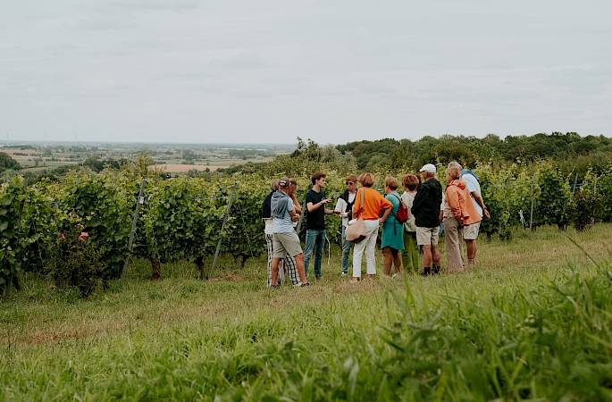 Martin en z'n team verwelkomen je graag bij Entre-Deux-Monts. Degusteer wijn naar keuze, geniet van een streepje muziek in onze belevingsweide of sluit aan bij één van de gratis rondleidingen op het domein. Vooraf inschrijven is niet nodig voor de Open Wijngaardfeesten of onze gratis rondleidingen op 5 & 6 juli.